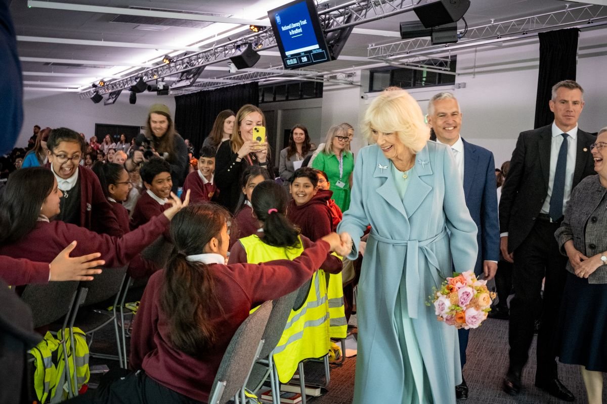 Photograph: Her Majesty Queen Camilla greeting Moreland Primary School pupils who are waving flags decorated with their favourite book characters. Credit: WeShootLondon